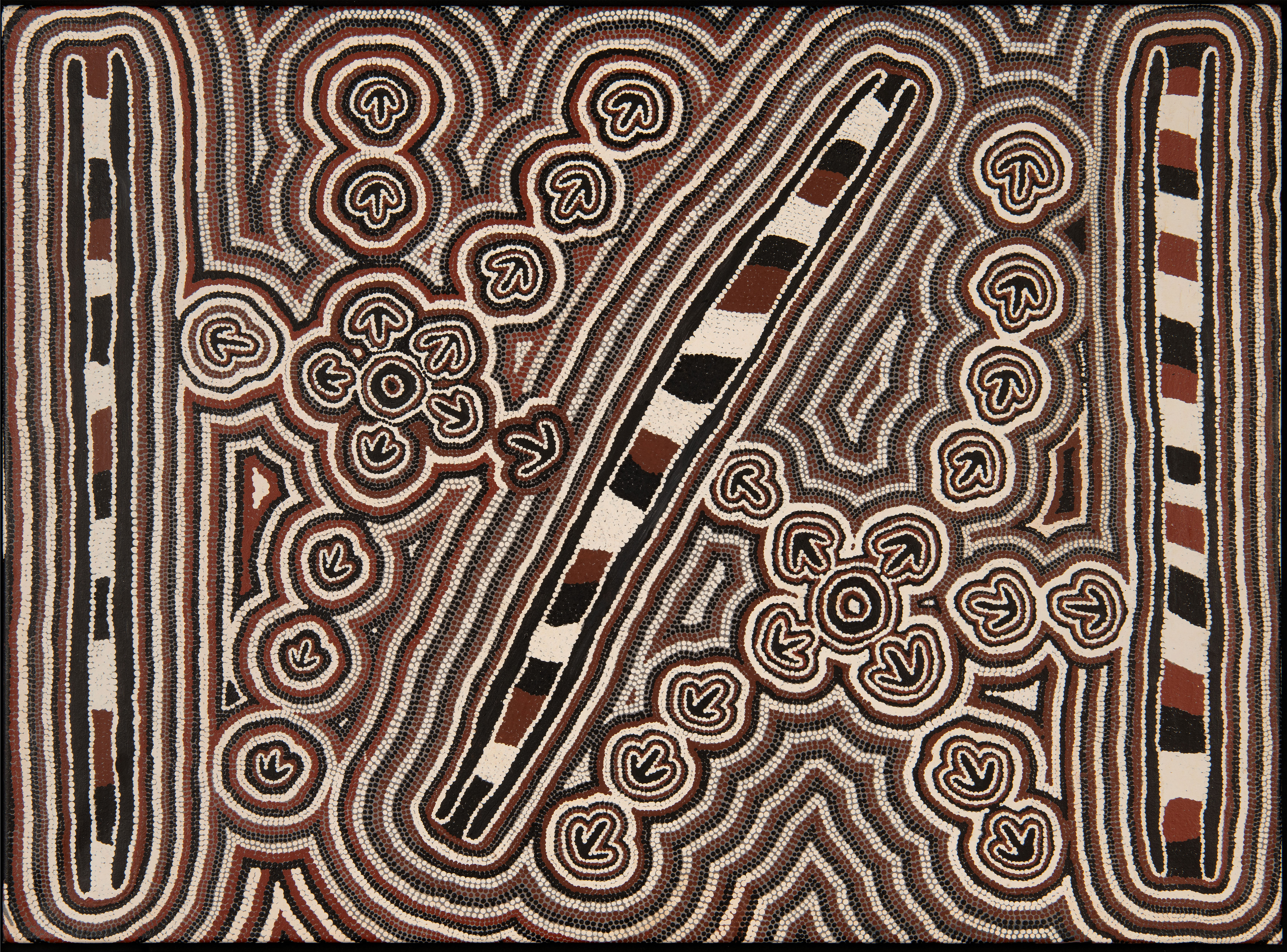 De afbeelding is van Biddy Long Nungarrayi (1932-); Bush Turkey Dreaming; Australië; ca. 2005; acryl op canvas; 7106-504. Plaatsbepalingen kun je op veel manieren in kaart brengen. Dit schilderij toont een ‘Dreaming’ van de Warlpiri mensen uit de Northern Territory. Hierop zingen en dansen de vrouwen als deel van een ceremonie over de boskalkoen wanneer die van waterpoel naar waterpoel reist om zich te voeden. De cirkels staan voor bestaande waterpoelen.