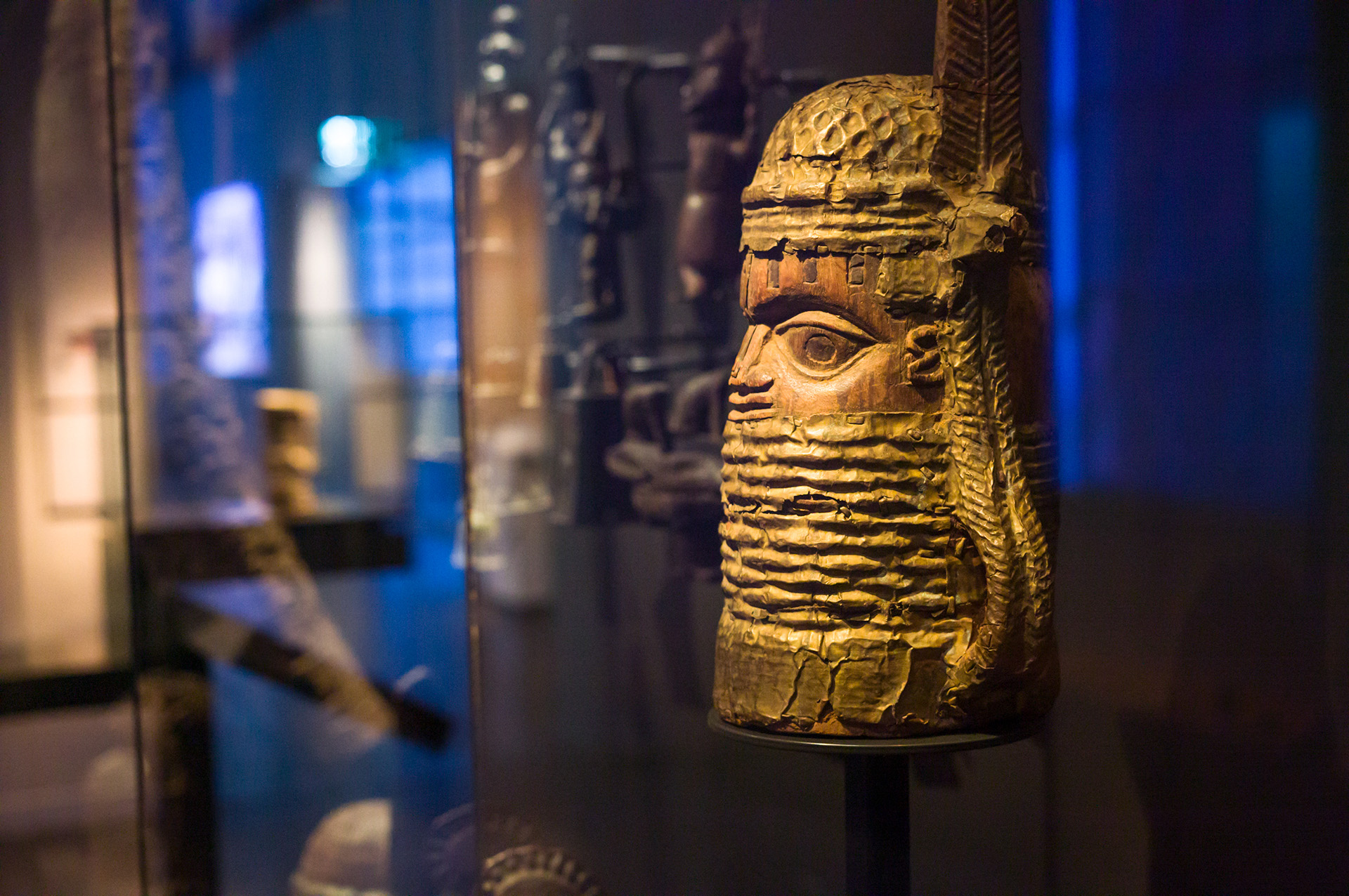 Bewerkte olifantslagtand, Benin, 1500 - 1891. Hoofd van een vorst (oba), Benin, 1600-1750. Beeld van een luipaard, Benin, 19e eeuw. Staf met 'bird of prophecy', Benin, voor 1993. Foto Boudewijn Bollmann